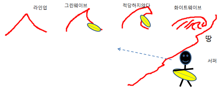 파도는 라인업 앞에서 물이 모이기 시작하면서 깨지지 않은 파도, 그린웨이브가 형성됩니다.