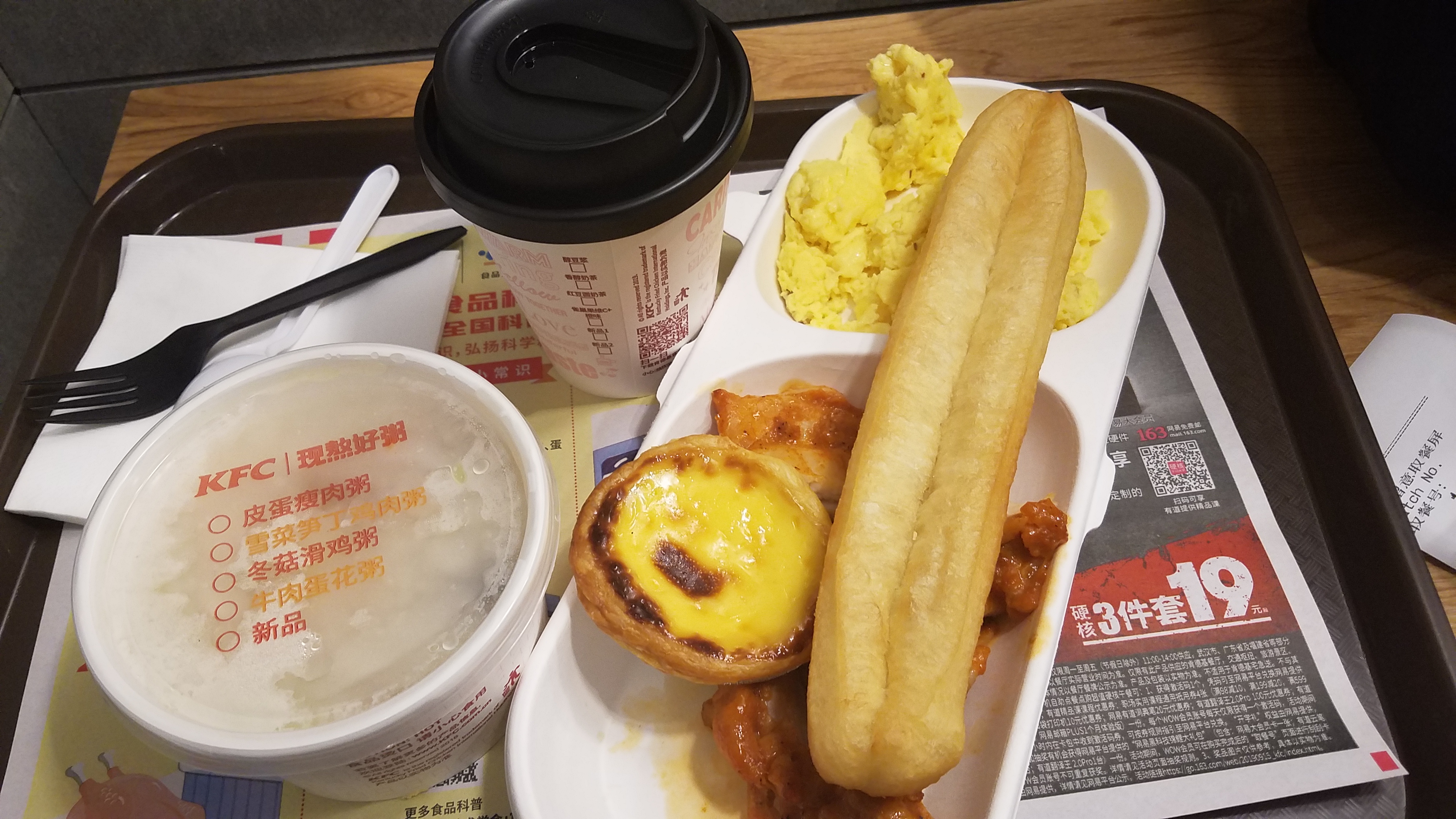 죽, 타르트, 길다란 빵(중국식꽈배기 요우타오), 닭, 두유, 스크렘블 이렇게 26 위안입니다.(4600원 가량)