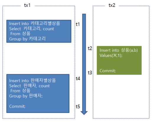 중간에 들어온 tx2 때문에 tx1 의 결과가 예상과 다른결과가 나오게 된다.