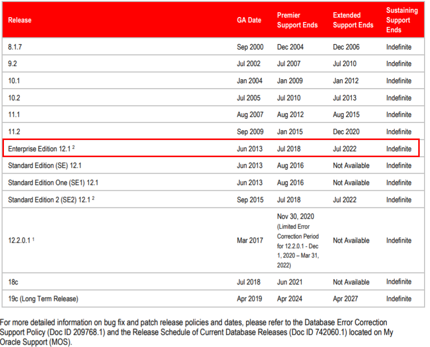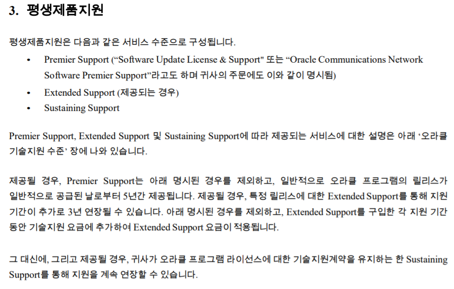오라클의 새 버전이 출시되면 premier support 가 공급일로부터 5년간 가능.