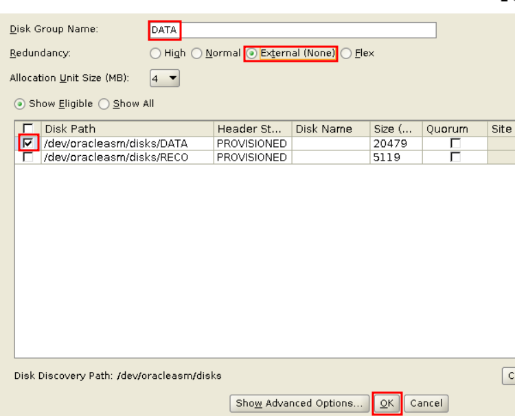 디스크그룹 이름을 DATA 로 하고 disk 선택 하고 하단의 Ok.