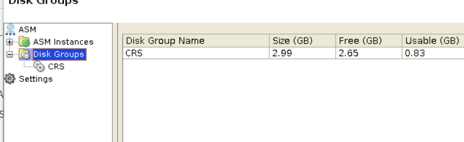 CRS 디스크그룹만 생성하고 grid 설치가 끝났다. 추가로 DATA, RECO 디스크 그룹을 만들자.