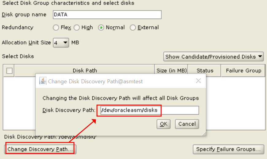 change discovery path 클릭, asm disk 가 있는 경로를 써준다.