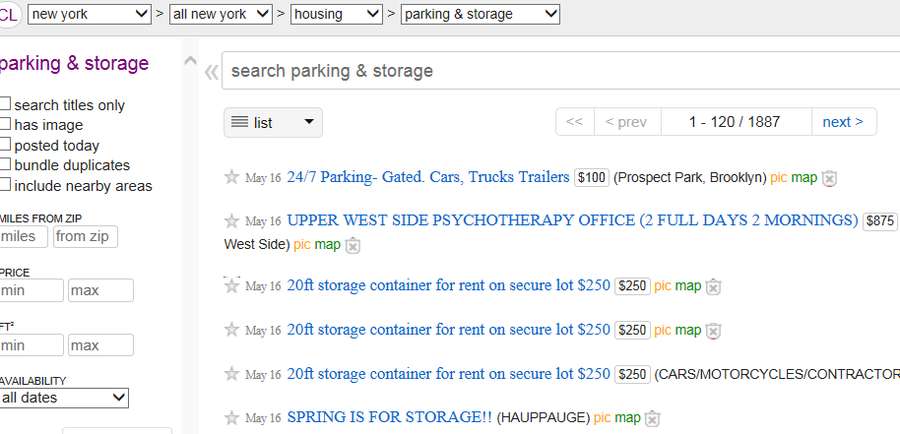 craigslist 를 잘 뒤져보면 parking/storage 가 있는데 돈받고 monthly 주차를 할수가 있다.