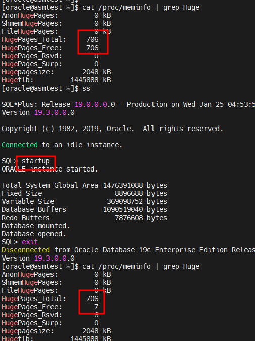 hugepage 를 사용하여 SGA 가 기동되었다.