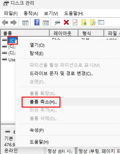나의 경우는 500G 를 하나의 디스크가 사용중이었는데 C 드라이브를 축소하고 할당되지 않은 볼륨을