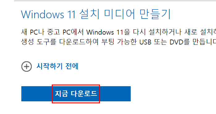 Windows 11 설치 미디어 만들기 => 지금 다운로드 클릭