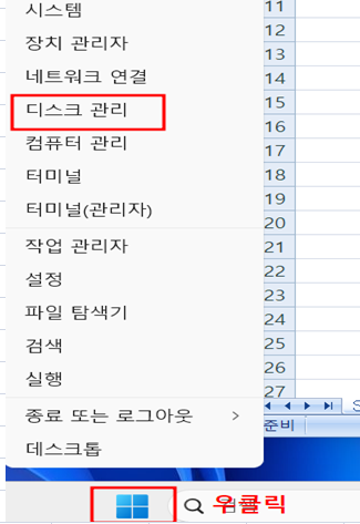 화면 하단의 윈도우 표시에 마우스를 올려놓고 우클릭을 하면 메뉴가 나오는데 "디스크 관리"를 선택한다.