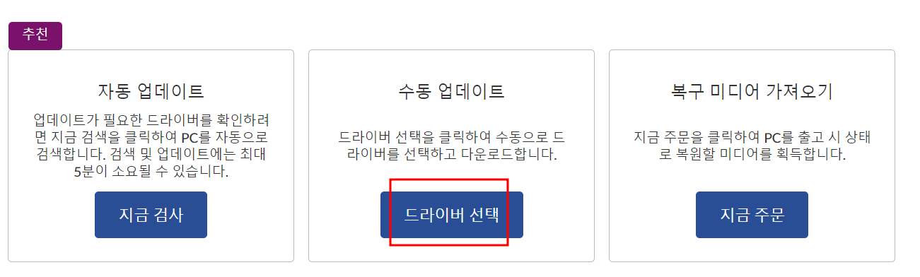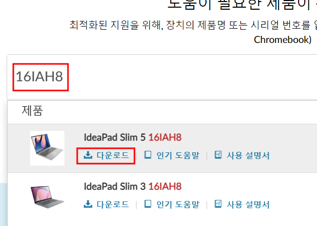 pc서포트 보기 => 제품명보기 16IAH8 => 다운로드 => 수동업데이트 => 드라이버선택