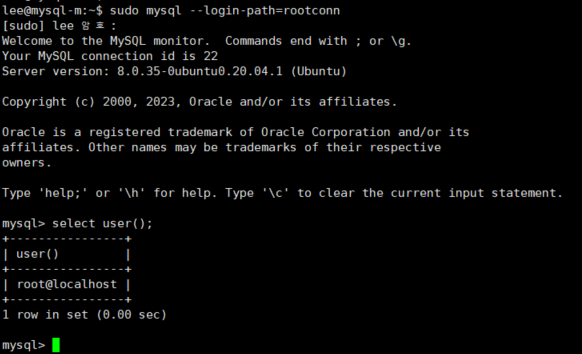 lee@mysql-m:~$ mysql_config_editor set --login-path=rootconn --host=localhost --user=root --password