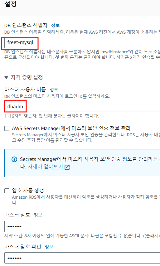 master 사용자 이름은 dbadm 으로 넣어줬다. root 를 사용하던 편한대로 넣어준다.