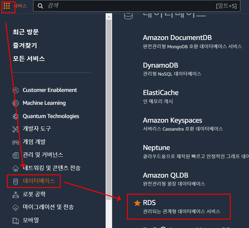 로그인 후 '서비스 옆 네모박스' -> 데이터베이스 -> RDS 클릭