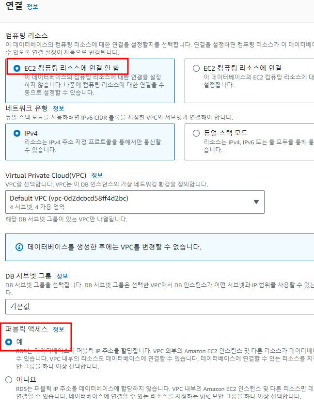연결설정은 로컬pc에서 붙을수 있게 퍼블릭액세스에 '예' 를 선택한다.