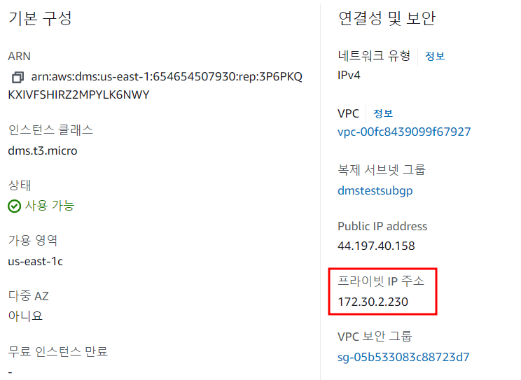 대상RDS 의 보안그룹의 인바운드 규칙에 DMS RI 의 주소를 추가해준다.