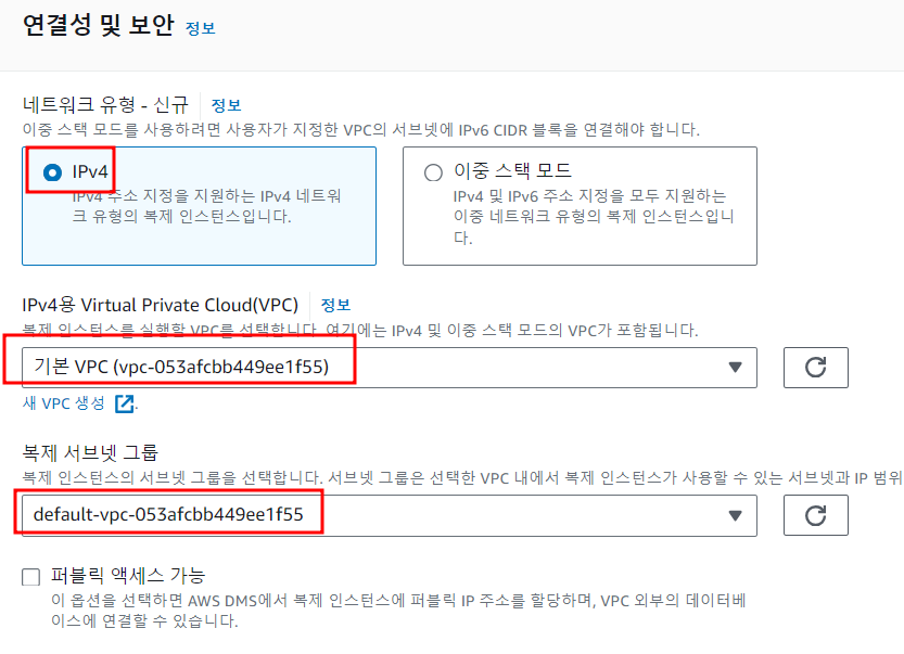 RI 가 속할 vpc 를 선택하고 위에 만들어둔 서브넷그룹을 선택한다.