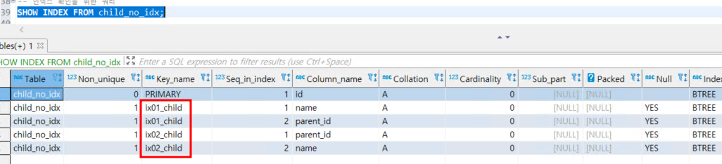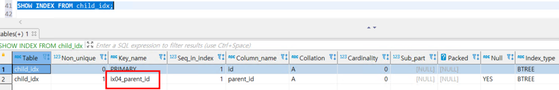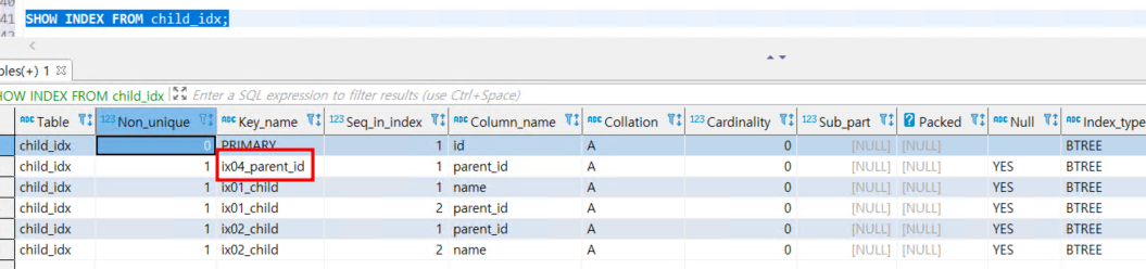 물론 ix02_child 인덱스가 parent_id 컬럼을 포함하므로 ix04_parent_id 인덱스는 삭제가 되어도 상관이 없다.
