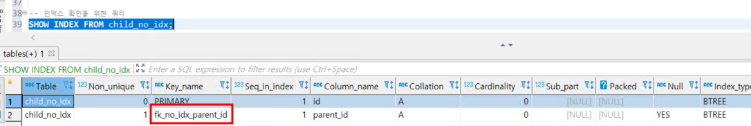 참조 제약조건 컬럼(parent_id) 을 선두로 하는 인덱스가 명시적으로 생기면 자동 생성된 인덱스가 사라진다.