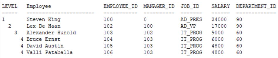 여기서는 각 레벨에서 급여(SALARY)를 기준으로 내림차순 정렬합니다. 예를 들어, LEVEL 4의 Bruce, David, Valli는 모두 같은 상사(Alexander)를 가지고 있으며, 이들은 급여 순으로 정렬됨.