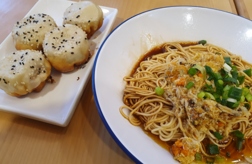 성지엔빠오는 밑에는 기름에 바삭하게 굽고 위에는 찌는 요리기법의 만두이다. 게살면은 상해가 원래 어촌이었고 게를 활용한 요리가 유명하다고 들은거 같아서 올커니 하고 먹어봤다.