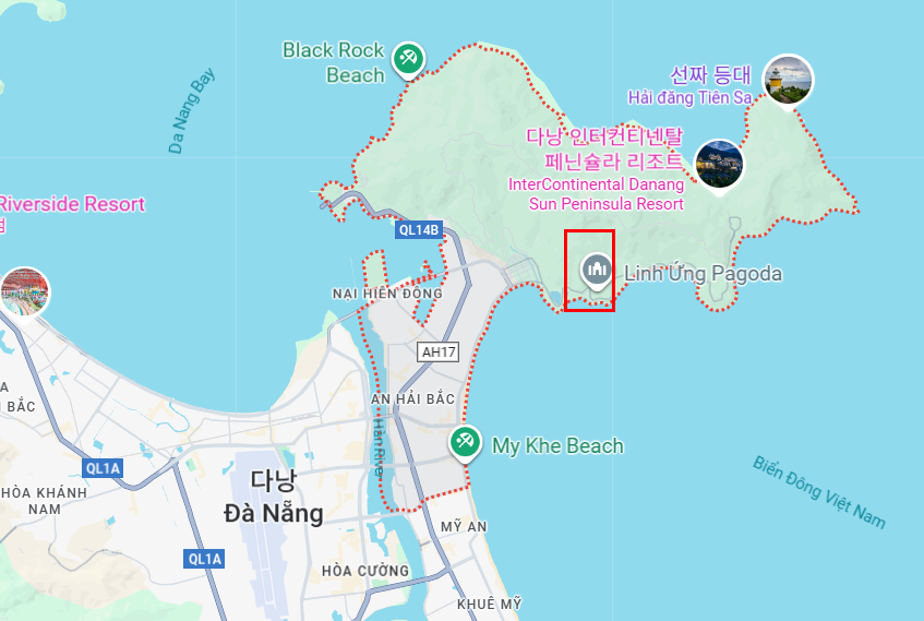 다낭 지도를 보면 해변 위쪽에 툭 튀어 나온 반도 지형이 있다.