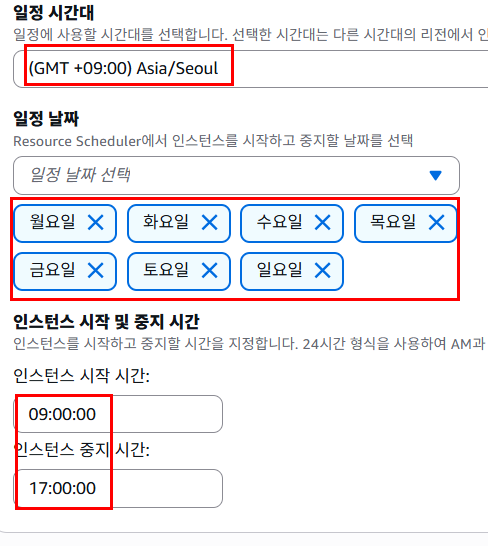 리소스 스케쥴러를 만들고 스케쥴러에 태그를 걸고, 대상 인스턴스에 동일한 태그를 적용하는 방식이다.