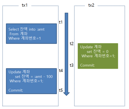 중간에 들어온 tx2 때문에 tx1 의 결과가 예상과 다른결과가 나오게 된다.