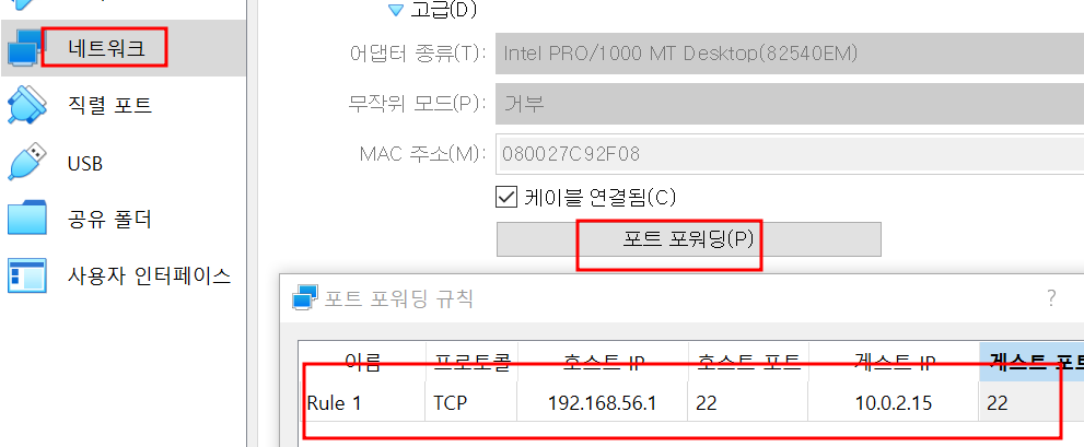 vm 관리자 에서 설정을 열어 포트포워딩 설정을 추가합니다.
