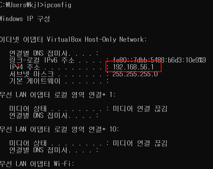 버추얼박스를 설치한 호스트머신(로컬pc) 에서 cmd 창을 열어 버추얼박스의 ip 를 확인합니다.