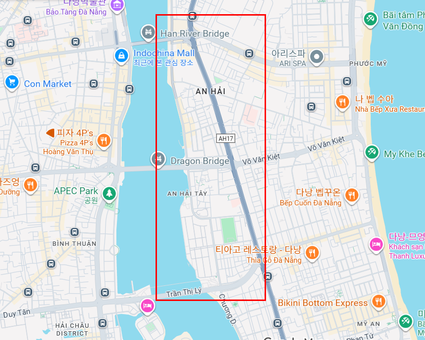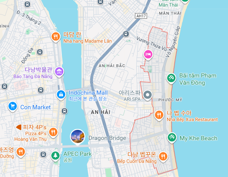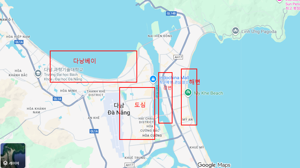 크게 1. 도심 2. 해변(푸옥미) 3. 한강변의 동쪽 강변 지역 4. 북쪽의 다낭베이 이렇게 나눌수 있다.