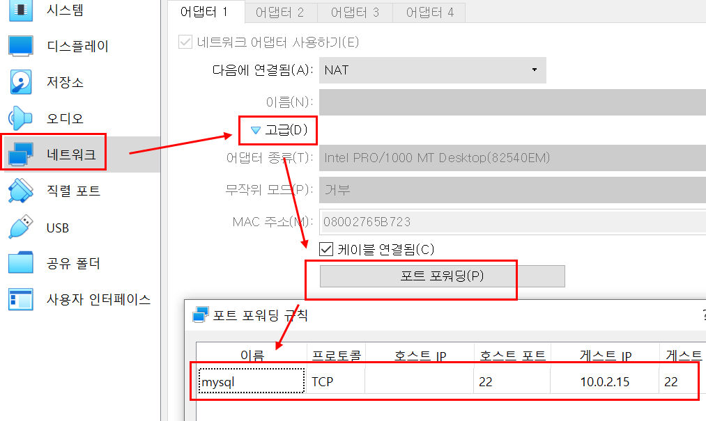 버추얼머신의 설정 -> 네트워크 를 누른다